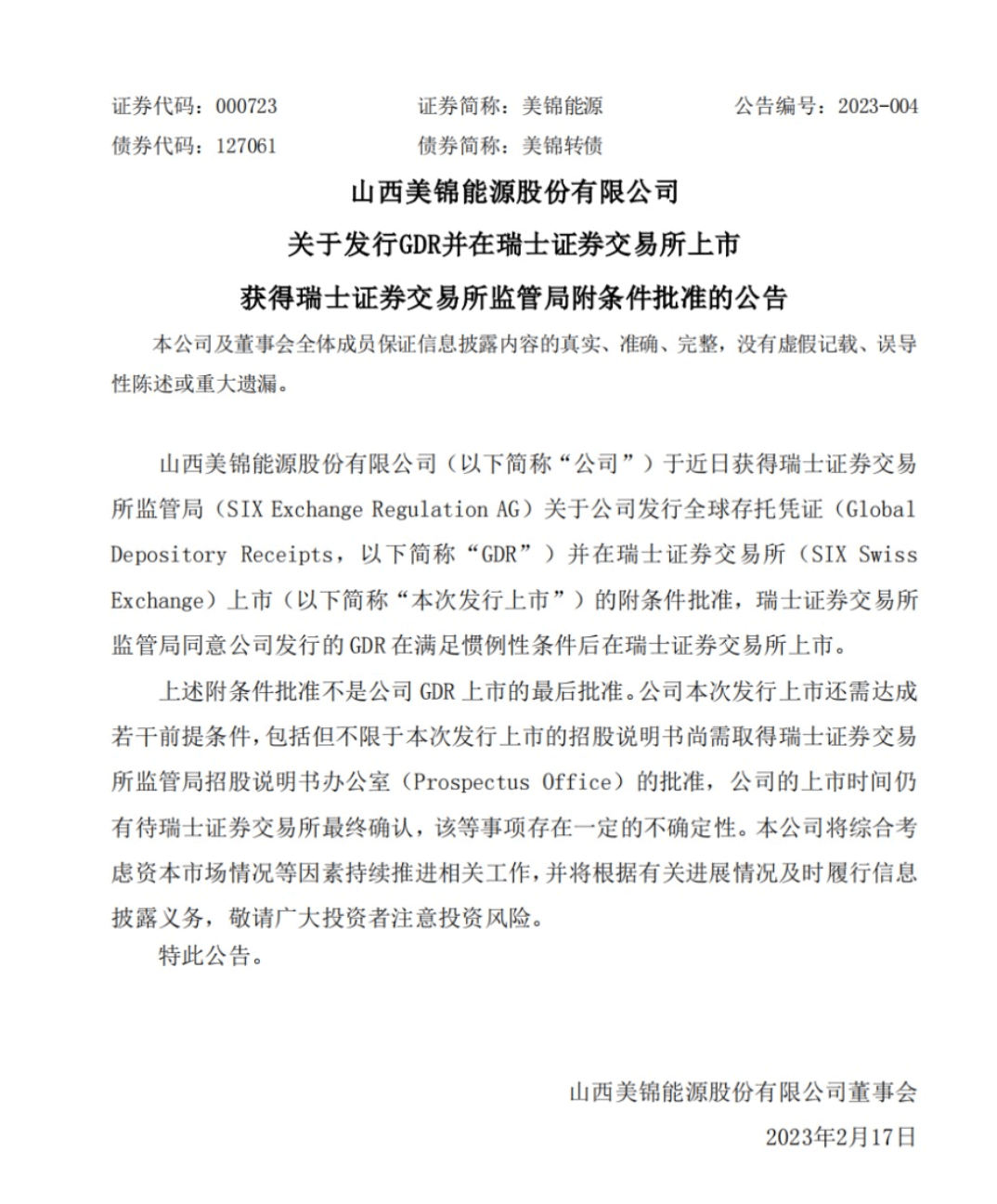 近日,美錦能源獲得瑞士證券交易所監(jiān)管局關(guān)于公司發(fā)行全球存托憑證(GDR)并在瑞士證券交易所上市的附條件批準(zhǔn),瑞士證券交易所監(jiān)管局同意公司發(fā)行的GDR在滿足慣例性條件后在瑞士證券交易所上市。