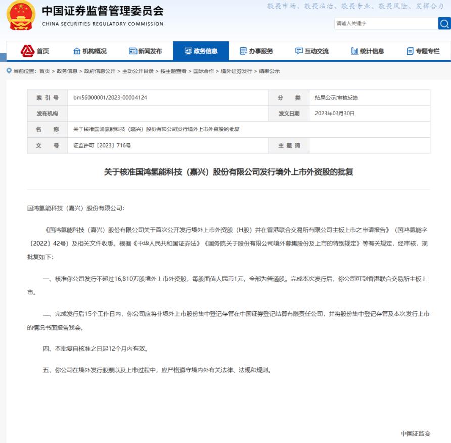 氫啟未來網(wǎng)獲悉,3月30日,中國證券監(jiān)督管理委員會官網(wǎng)發(fā)布了一份重要文件:《關(guān)于核準(zhǔn)國鴻氫能科技(嘉興)股份有限公司發(fā)行境外上市外資股的批復(fù)》。這是根據(jù)《中華人民共和國證券法》和《國務(wù)院關(guān)于股份有限公司境外募集股份及上市的特別規(guī)定》等相關(guān)規(guī)定進(jìn)行的審核。