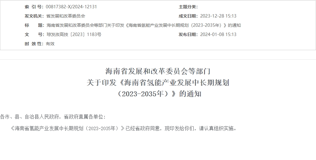 海南省七部門聯(lián)合印發(fā)《海南省氫能產(chǎn)業(yè)發(fā)展中長期規(guī)劃(2023-2035年)》