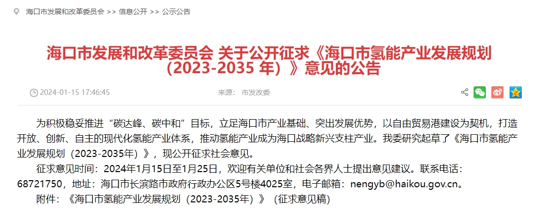 1月15日,海口市發(fā)展和改革委員會研究起草了《海口市氫能產(chǎn)業(yè)發(fā)展規(guī)劃(2023-2035年)》,現(xiàn)公開征求社會意見。