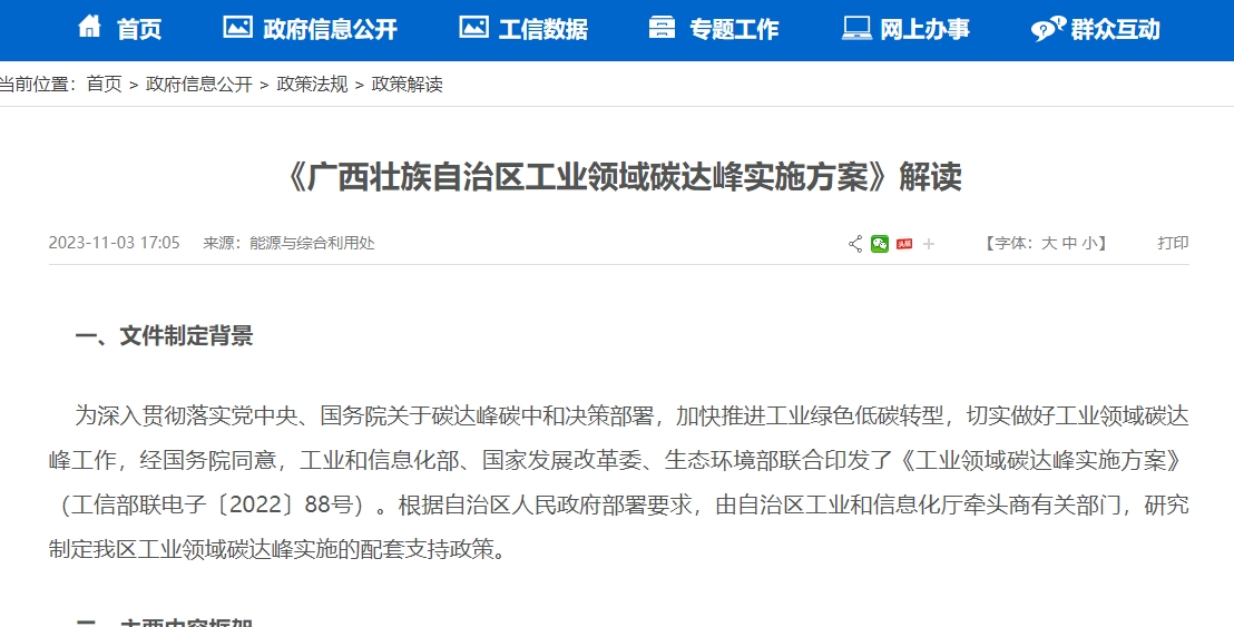 近日,廣西壯族自治區(qū)工業(yè)和信息化廳與廣西壯族自治區(qū)發(fā)展和改革委員會、廣西壯族自治區(qū)生態(tài)環(huán)境廳聯(lián)合印發(fā)了《廣西壯族自治區(qū)工業(yè)領(lǐng)域碳達峰實施方案》