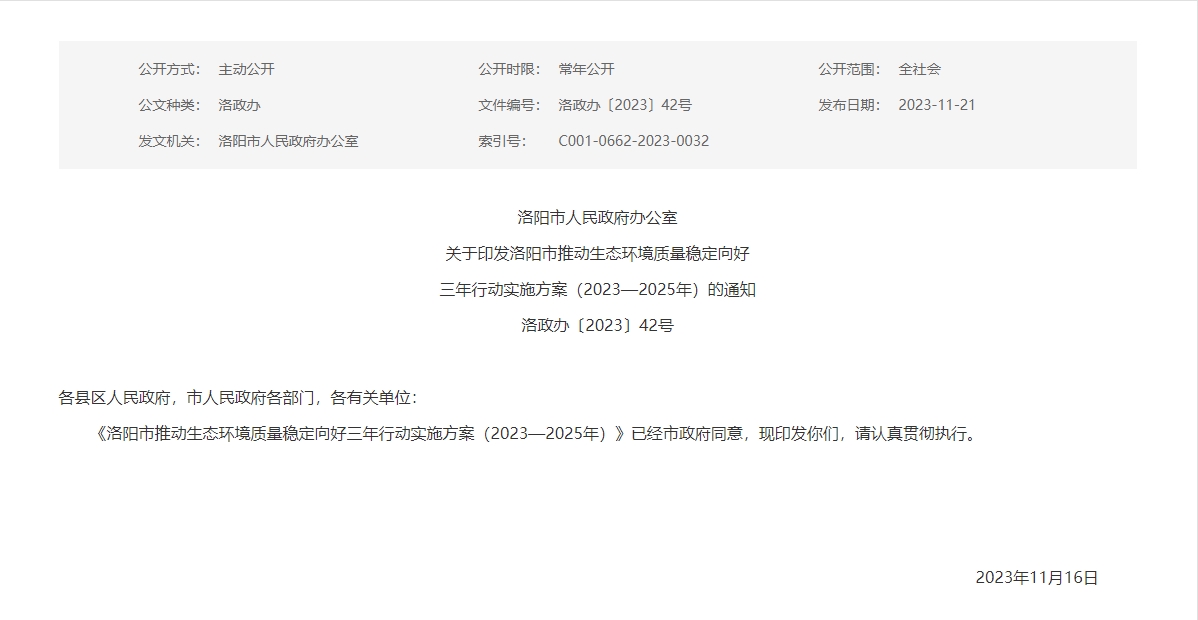 《洛陽市推動生態(tài)環(huán)境質(zhì)量穩(wěn)定向好三年行動實施方案(2023-2025年)》