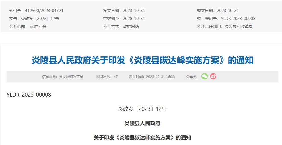 10月31日,湖南株洲炎陵縣在其官網(wǎng)發(fā)布了關(guān)于印發(fā)《炎陵縣碳達(dá)峰實(shí)施方案》的通知。