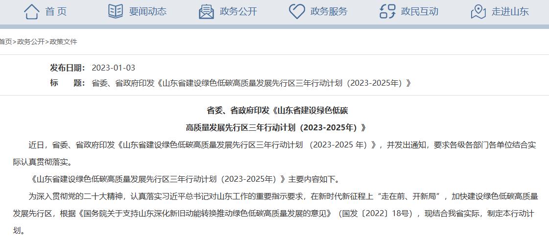 1月3日,山東省委、省政府印發(fā)《山東省建設(shè)綠色低碳高質(zhì)量發(fā)展先行區(qū)三年行動(dòng)計(jì)劃 (2023-2025 年)》