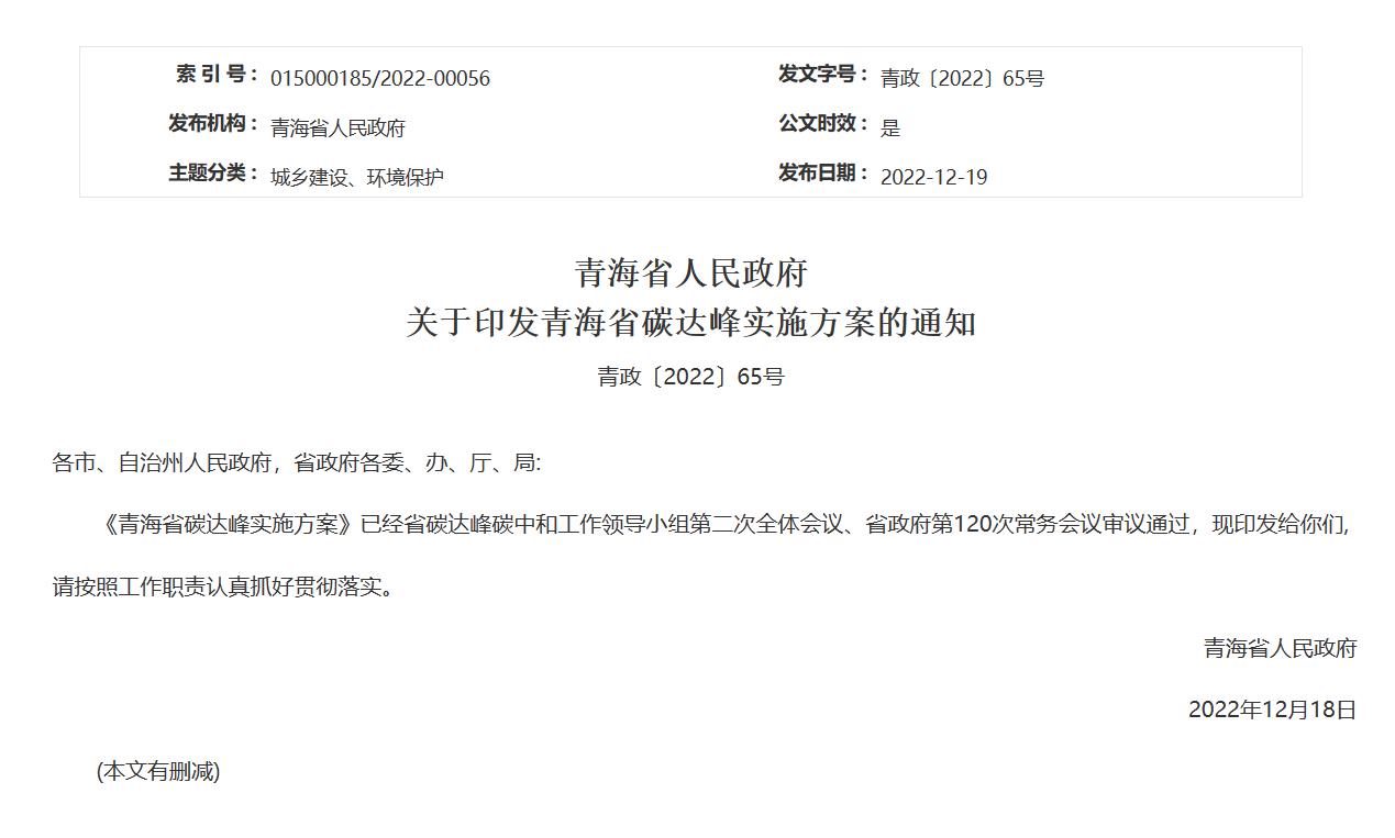 12月19日,青海省人民政府發(fā)布關(guān)于印發(fā)青海省碳達峰實施方案的通知