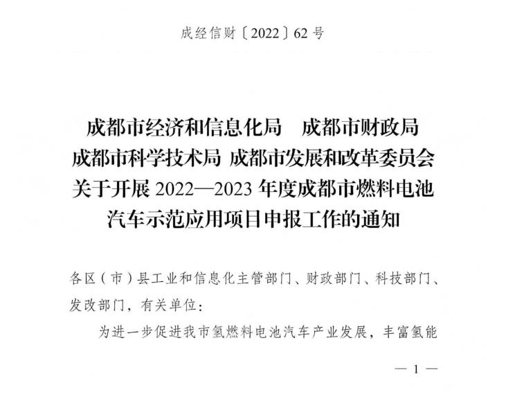 12月22日,成都市經(jīng)濟和信息化局、成都市財政局、成都市科學(xué)技術(shù)局、成都市發(fā)展和改革委員會4部門聯(lián)合印發(fā)《關(guān)于開展2022-2023年度成都市燃料電池汽車示范應(yīng)用項目申報工作》的通知。