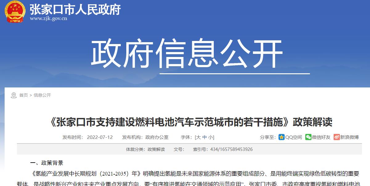 氫啟未來(lái)網(wǎng)獲悉,7月12日張家口市人民政府官網(wǎng)發(fā)布《張家口市支持建設(shè)燃料電池汽車(chē)示范城市的若干措施》政策解讀