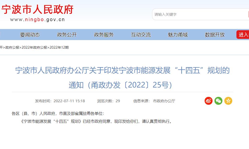 氫啟未來(lái)網(wǎng)消息,7月11日,寧波市人民政府在其官網(wǎng)發(fā)布關(guān)于印發(fā)寧波市能源發(fā)展“十四五”規(guī)劃的通知