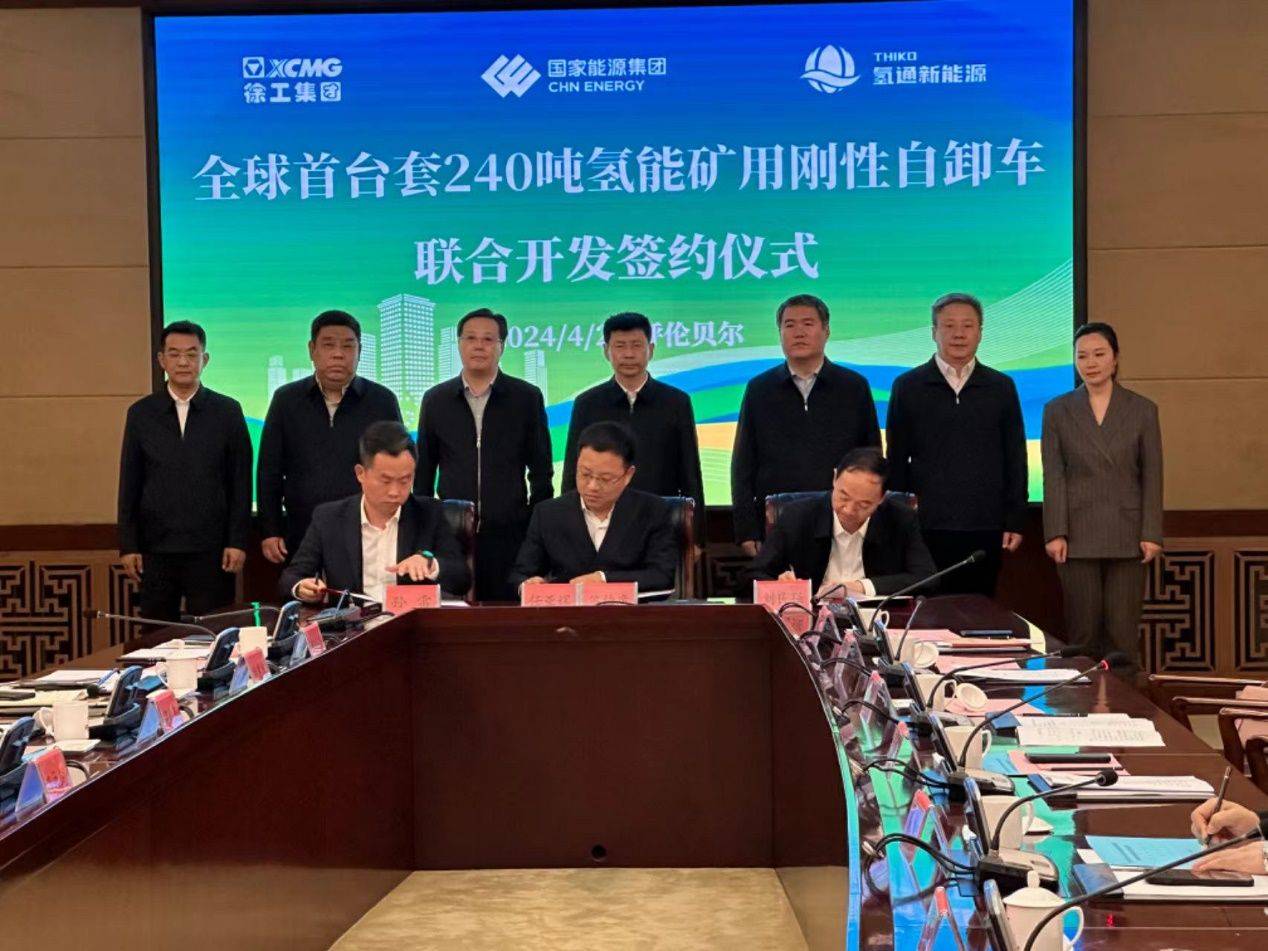 2024年4月24日下午,國家能源集團、徐工集團、氫通新能源三方在呼倫貝爾舉行全球首臺套240噸氫能礦用剛性自卸車聯合開發(fā)簽約儀式。國能寶日希勒能源有限公司總經理劉民強、徐州工程機械集團有限公司黨委副書記、集團總經理孫雷、氫通(上海)新能源科技有限公司董事長兼CEO任亞輝分別代表三方進行簽約。呼倫貝市市委副書記、市長及永乾、市委常委、常務副市長胡兆民、市政府秘書長徐景睿、市工信局局長魏云鵬、市能源局局長何偉...