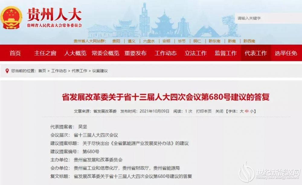 近日,貴州省發改委發布省十三屆人大四次會議第680號建議的答復,回復了“關于盡快出臺《全省氫能源產業發展獎補辦法》的建議”。目前,《貴州省“十四五”氫能發展規劃》已完成征求意見、專家評審,正在報批程序中。
