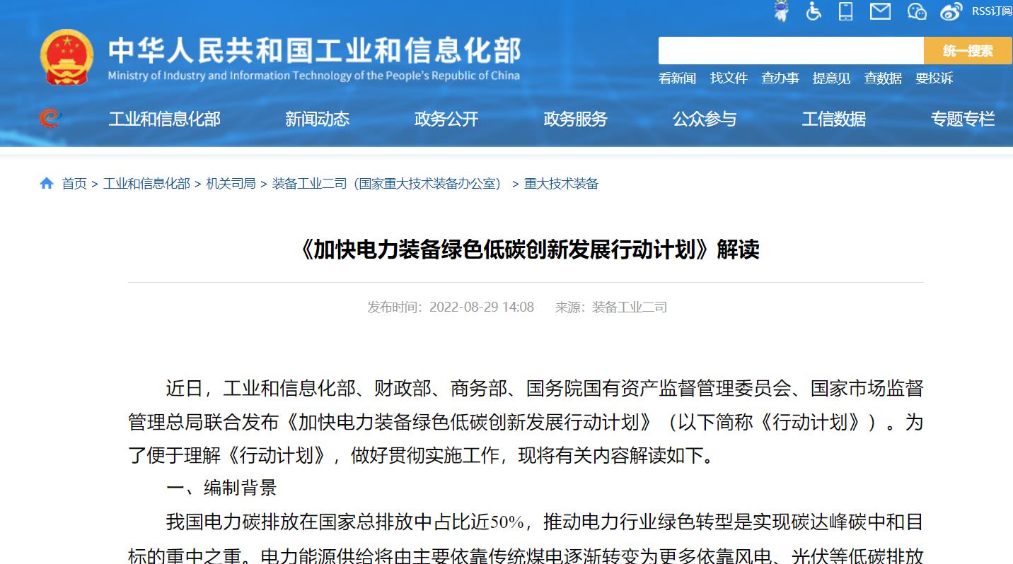 近日,工業和信息化部、財政部、商務部、國務院國有資產監督管理委員會、國家市場監督管理總局聯合發布《加快電力裝備綠色低碳創新發展行動計劃》(以下簡稱《行動計劃》)