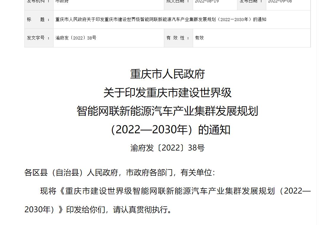 9月8日,重慶市政府發布關于印發《重慶市建設世界級智能網聯新能源汽車產業集群發展規劃(2022—2030年)》的通知(以下簡稱《規劃》)。