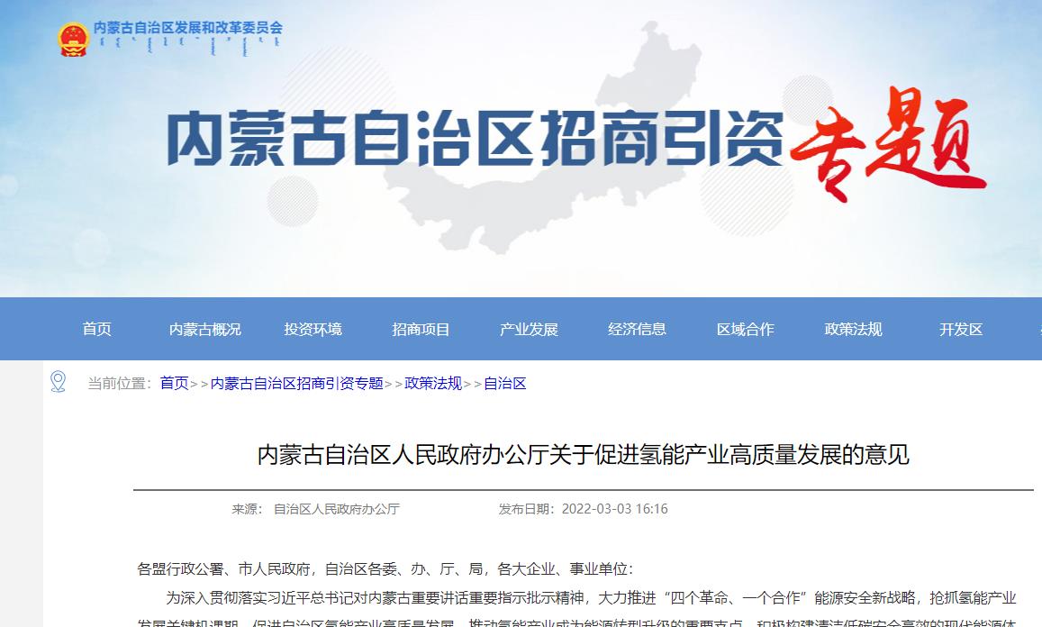 內蒙古自治區人民政府辦公廳關于促進氫能產業高質量發展的意見