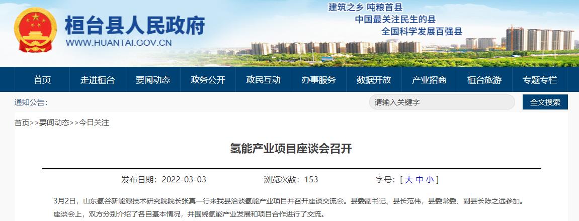 3月2日,山東氫谷新能源技術研究院院長張真一行來桓臺縣洽談氫能產業項目并召開座談交流會。桓臺縣委副書記、縣長范偉、縣委常委、副縣長陳之遠出席了會議。張真一行表示,通過本次座談會交流,全面了解桓臺氫能產業的基本情況、發展現狀和未來規劃。
