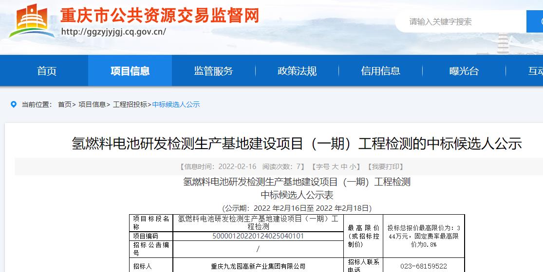 氫燃料電池研發檢測生產基地建設項目(一期)工程檢測,中標候選人公示表(公示期:2022 年2月16日至 2022 年2月18日)