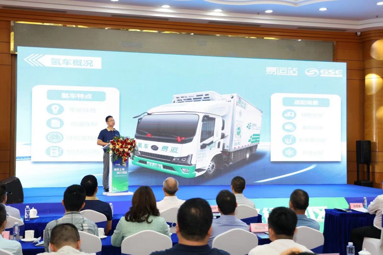 廣東易運物流供應鏈有限公司運營總監何偉輝對氫能冷鏈物流車運營項目進行介紹。他表示,“綠色運蔬”項目是以易運農產品交易中心每日超萬噸的農產品分流到周邊城市的城配運輸的場景為依托,開展氫能車農產品配送應用。