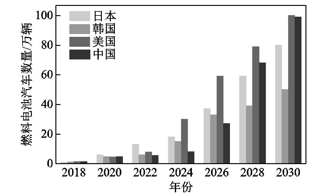 圖1 2018 - 2030年部分國家的燃料電池汽車