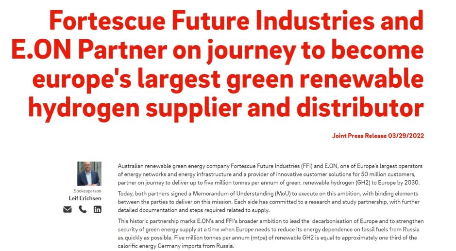 歐洲當(dāng)?shù)貢r(shí)間周二,德國(guó)能源公司E.ON與澳大利亞Fortescue未來工業(yè)聯(lián)合發(fā)表聲明,宣布將共同建設(shè)綠氫生產(chǎn)和歐洲分發(fā)渠道,長(zhǎng)期目標(biāo)是在2030年一年提供500萬噸綠氫。