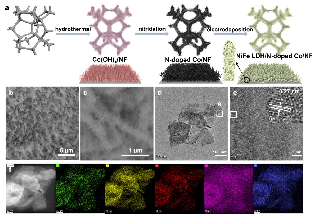 研究成果提出了一種自上而下的分級結構陽極構建策略,通過水熱-氣相還原氮化-電沉積方法合成了一種具有分級結構的NiFe LDH/N-doped Co/NF電極。這一電極的分級結構體現在由自支撐泡沫鎳(NF)基底上生長N摻雜Co(N-doped Co)納米線陣列,并在納米線上生長NiFe LDH納米片。NiFe LDH/N-doped Co/NF電極表現出卓越的OER性能:僅需262 mV的過電位就可達到100 mA cm-2的電流密度,并在100小時工作中僅增加7 mV過電位。以該電極為陽極組裝的AEMWE器件僅需1.63V的槽壓就能達到1 A cm-2的電流密度,超越大多數已報道陽極的性能。相關的結構表征和對照實驗表明,分級結構陽極通過納米線陣列的中間層增加電極活性比表面積,加強催化劑與基底之間的結合力,提高了活性和穩定性。