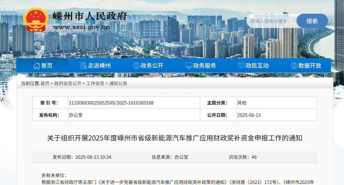 8月13日,嵊州市人民政府發布組織開展2025年度嵊州市省級新能源汽車推廣應用財政獎補資金申報工作的通知,申報領域包括了氫燃料電池汽車整車、關鍵零部件投資及技術改造項目。需要注意,申報材料要于2025年8月19日前上報市發改局、市財政局紙質版各一份,并同時報送電子版(跟紙質材料一致)各一份,逾期或材料不符合要求的不予受理。