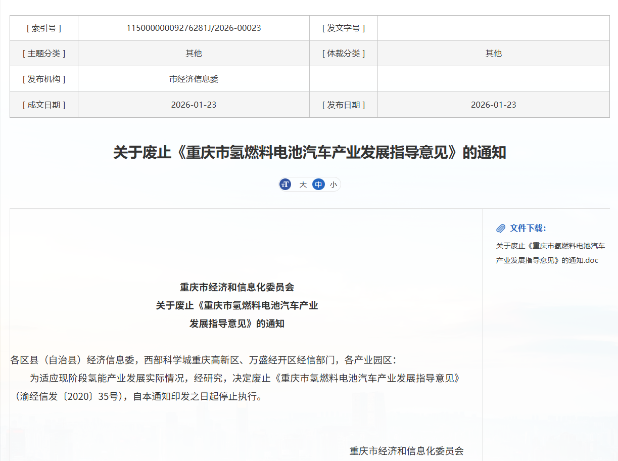 1月23日,重慶市經(jīng)濟(jì)和信息化委員會(huì)發(fā)布廢止《重慶市氫燃料電池汽車產(chǎn)業(yè)發(fā)展指導(dǎo)意見(jiàn)》的通知。通知顯示,為適應(yīng)現(xiàn)階段氫能產(chǎn)業(yè)發(fā)展實(shí)際情況,經(jīng)研究,決定廢止《重慶市氫燃料電池汽車產(chǎn)業(yè)發(fā)展指導(dǎo)意見(jiàn)》(渝經(jīng)信發(fā)〔2020〕35號(hào)),自通知印發(fā)之日起停止執(zhí)行。