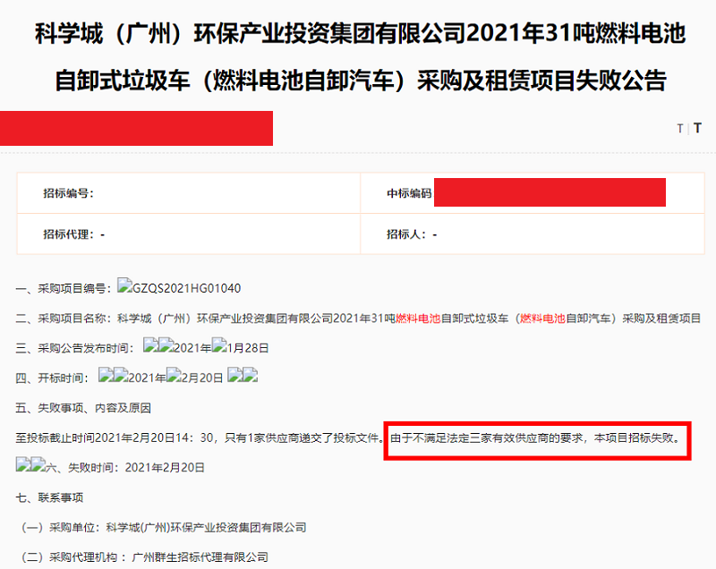 2021年2月20日,科學城(廣州)環保產業投資集團有限公司的500輛31噸燃料電池自卸式垃圾車采購及租賃項目,因只有1家供應商提供了投標文件,不滿足法定要求,公告失敗。