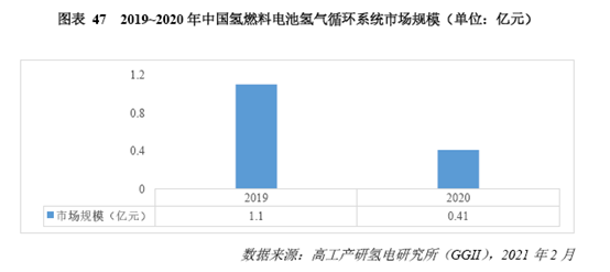 從市場規(guī)模來看,2020年國內(nèi)氫循環(huán)系統(tǒng)的市場規(guī)模預計為0.41億元,同比2019年下降了63%,下降原因主要是出貨量減少和氫循環(huán)泵價格的下降。