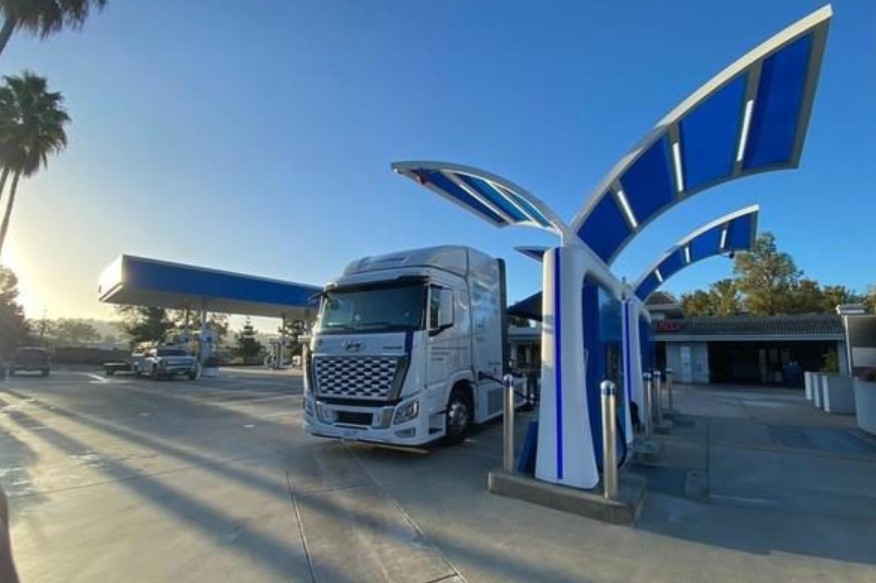 氫動力燃料電池汽車在True Zero氫零售站排隊等待再補給。FirstElement是True Zero品牌氫氣零售站的開發商、所有者和運營商,目前是世界上最大的氫氣零售站網絡。