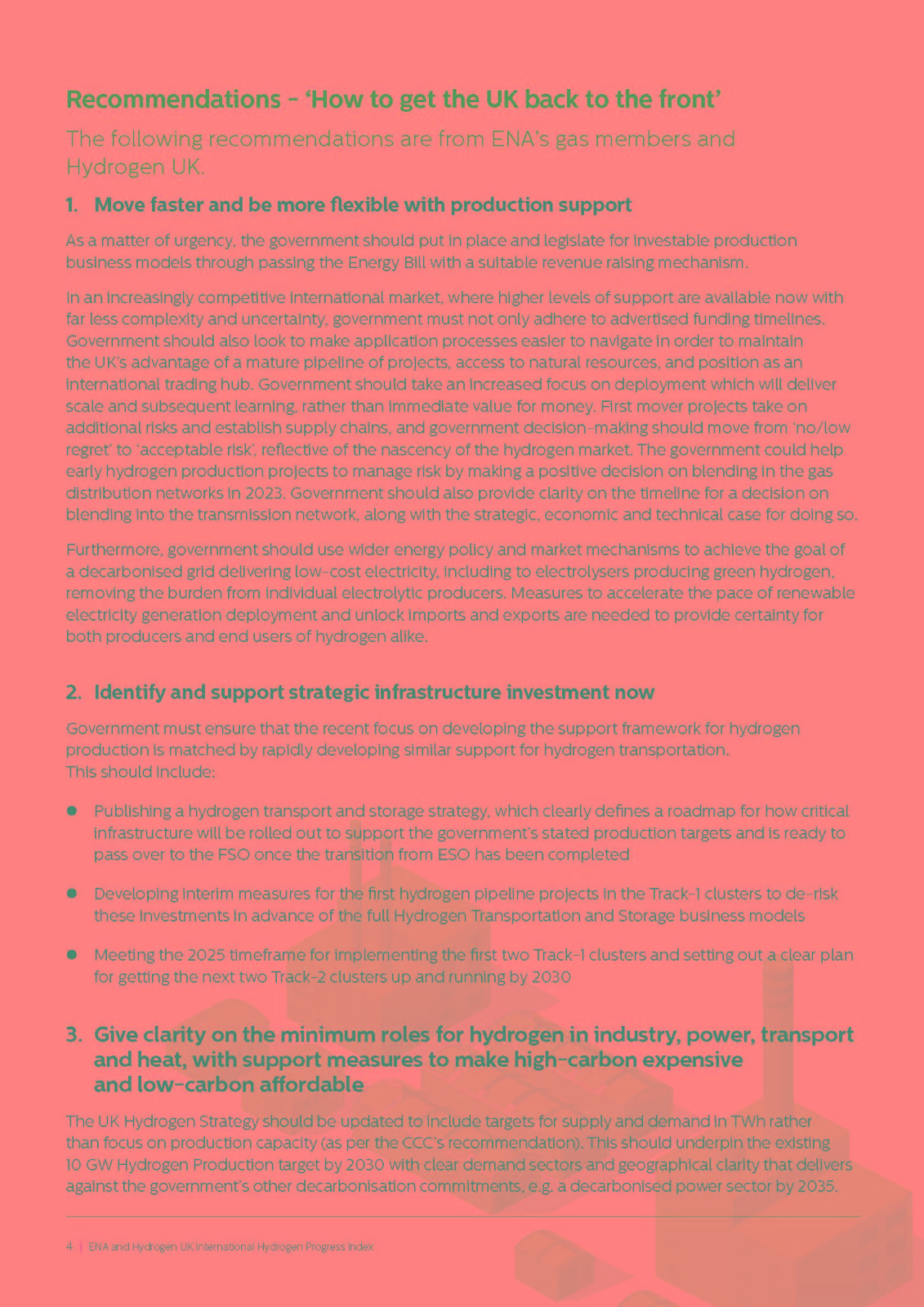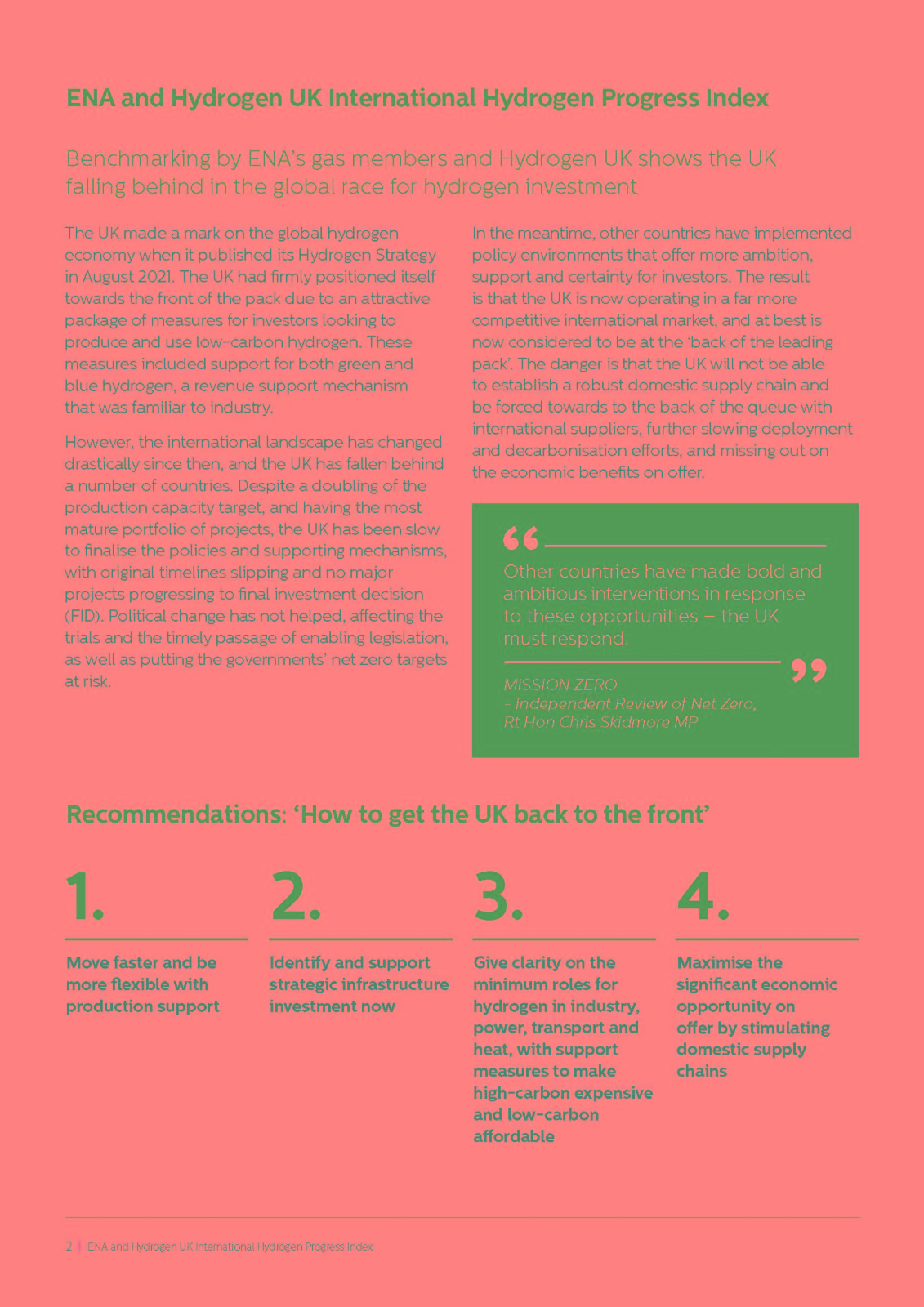 報告指出:“危險在于,英國將無法建立健全的國內供應鏈,被迫排在國際供應商的后面,從而進一步減緩部署和脫碳努力,錯失由此帶來的經濟效益?!盓NA和Hydrogen UK的成員建議英國在生產支持方面采取更快、更靈活的行動,并表示:“作為一項緊急事項,政府應該通過《能源法案》,制定可投資的生產商業模式,并建立適當的收入增加機制。”