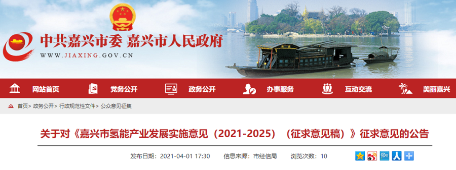 4月1日,嘉興市人民政府公示《嘉興市氫能產業發展實施意見(2021-2025)(征求意見稿)》,向社會公開征求意見。公告截止到4月13日。根據草案,嘉興市將要用5年時間建成氫能產業鏈完整、創新能力強、基礎設施完善、應用場景多樣、影響力顯著的氫能發展示范城市。