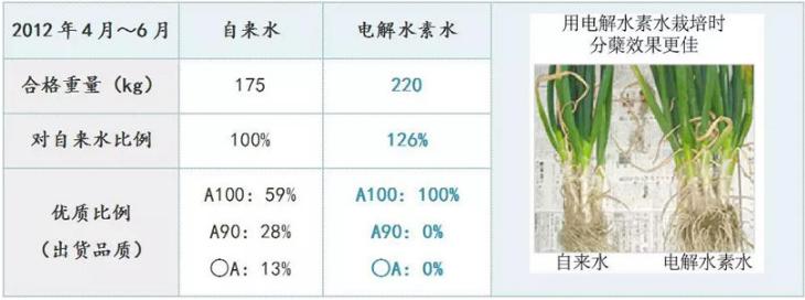 電解水素水栽培后,出貨重量增加了26%,比起用自來水澆灌時質量上參差不齊的現象,電解水素水栽培出來的大蔥全部實現高質量。