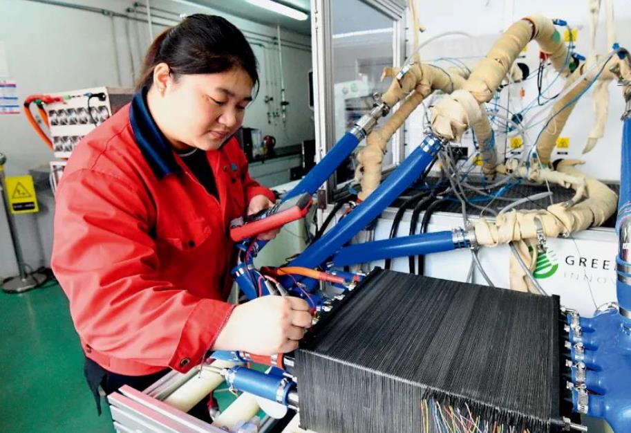 (2017年11月10日,江蘇南通百應能源有限公司的檢測員正在對氫燃料電池進行電堆性能測試。圖/新華)