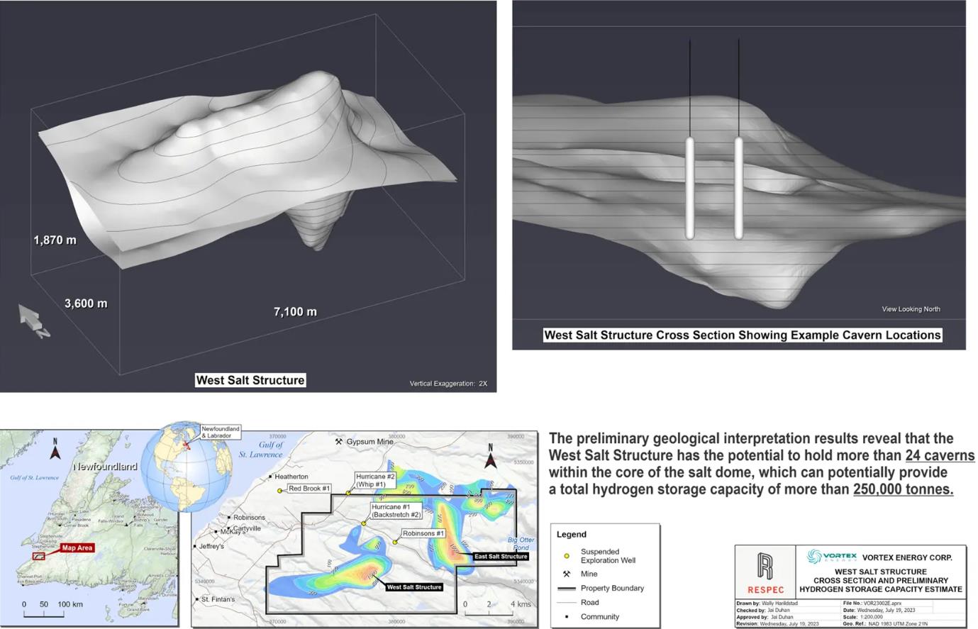 Vortex Energy在2023年6月宣布確定了兩個(gè)大型鹽結(jié)構(gòu)后,緊接著與RESpec咨詢公司簽約,生成初步的洞穴布局,并進(jìn)行高級(jí)熱力學(xué)計(jì)算,以估計(jì)兩個(gè)結(jié)構(gòu)的存儲(chǔ)容量。根據(jù)Respec的計(jì)算,東部結(jié)構(gòu)可以在超過35個(gè)洞穴中容納約55萬(wàn)噸氫氣,而“樂觀估計(jì)”則可以在超過53個(gè)洞穴中容納多達(dá)90萬(wàn)噸氫氣。據(jù)保守估計(jì),總?cè)莘e超過7000萬(wàn)立方米。