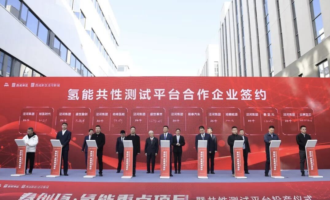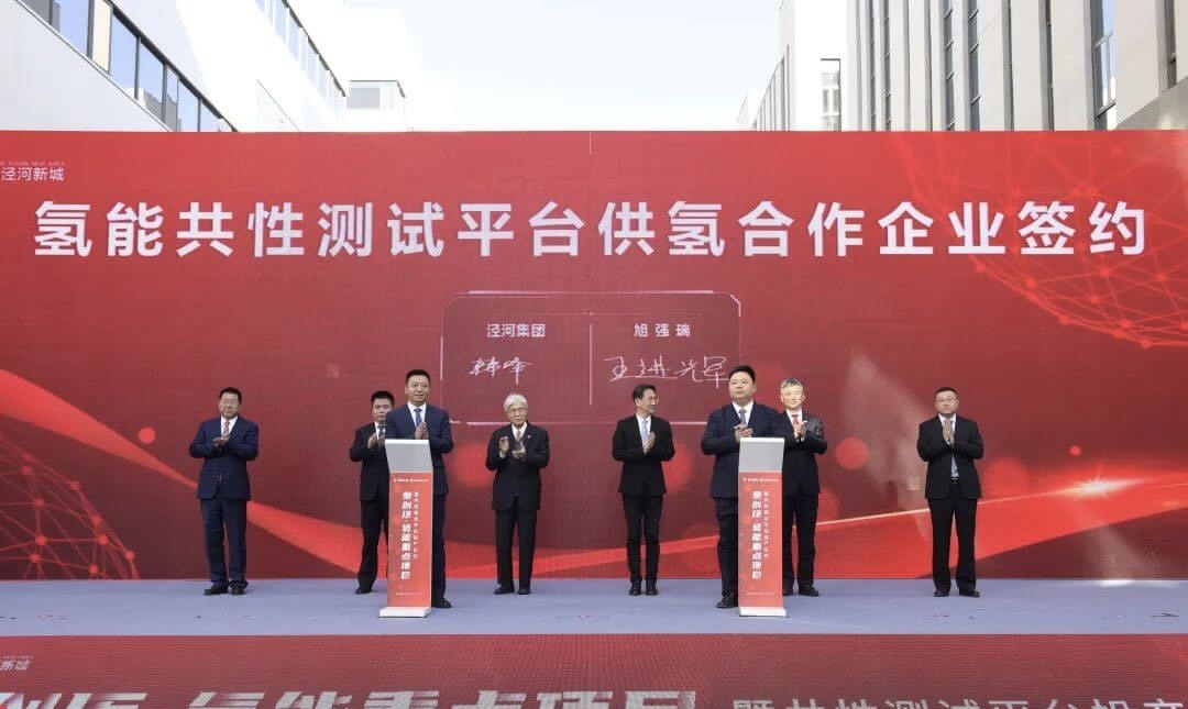 陜西旭氫時代科技有限公司董事長王海峰代表公司發言。王總表示,旭氫時代氫燃料電池堆產線的投產,標志著陜西省首個以氫燃料電池為核心的產業化示范項目正式落地,這是公司深入貫徹落實陜西氫能產業規劃部署的務實舉措,對助力打造以西安為中心的氫能裝備研發制造中心具有里程碑式意義。作為氫能產業鏈“鏈上企業”,旭氫時代將以此次投產為新的起點,按照陜西省委、省政府的戰略部署,以集團公司資源和場景優勢聚集發展要素,搶抓氫能產業發展戰略機遇,規劃為先,先行先試,引領陜西氫燃料電池產業發展。首先,做大優勢,夯實公司氫源成本及質量優勢,為氫燃料電池產業化發展提供氫氣儲備;做強技術,深化兩鏈融合,構建自立自強創新研發體系,不斷向產業上下游探尋求索,將氫燃料電池業務打造成為陜西氫能產業發展的新名片;做好配套,健全燃料電池共性測試平臺運營管理體系,為燃料電池產業化提供全方位的用氫-測試服務;做實場景,協同產業伙伴推進氫能重卡示范應用規模化、市場化,3年實現1000輛氫車運營,打造西北示范性優質氫能車輛運營服務平臺;整合資源,高點站位謀劃零碳氫能產業園布局,探索園區綠色發展新路徑,全方位構建氫能產業生態,加快形成新質生產力,為陜西省氫能產業延鏈補鏈強鏈、構建氫能社會、實現綠色低碳發展作出更大貢獻。在簽約儀式環節,涇河集團分別與旭氫時代等8家企業進行了燃料電池共性測試平臺合作簽約,與旭強瑞進行了供氫合作企業簽約,與農業銀行等5家金融機構進行了氫能重點項目合作金融機構簽約。