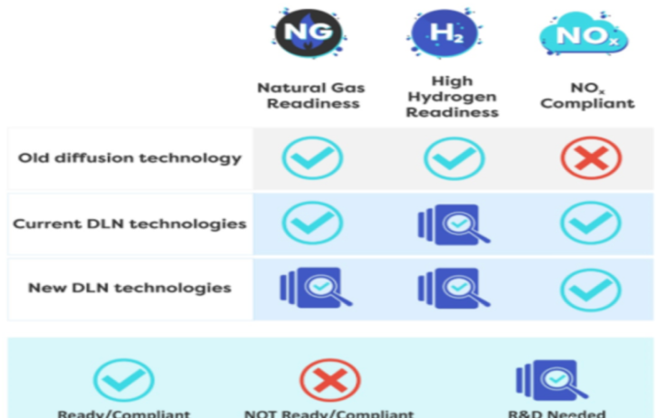 簡而言之,氫無疑是一種可以接受的、非常清潔的燃料。目前,有H2水平為50%的低NOx燃氣輪機與天然氣配合使用。用純氫操作的系統也已開發出來。未來的一個關鍵發展挑戰是低氮氧化物、燃料靈活的系統,可以輕松地使用各種燃料組件,從純天然氣到純氫。下面的圖表概述了這些使用氫的不同技術的成熟度、開發要求和氮氧化物遵從性。