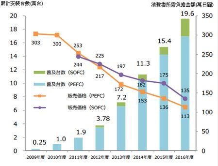 在2009年產(chǎn)品推廣前夕,日本政府同意每套燃料電池補(bǔ)貼140萬日元或者制造成本的一半,并做出補(bǔ)貼多年的承諾。雖然每套設(shè)備的補(bǔ)貼力度下降,但是總的補(bǔ)貼預(yù)算不斷升高。在2009年大約安裝了2300套燃料電池設(shè)備,現(xiàn)在這個數(shù)字已經(jīng)慢慢增長至超過12000套,而每套設(shè)備的補(bǔ)貼則降至了500000至600000日元。而從2012年開始銷售量差不多翻倍。2015年ENE-FARM的補(bǔ)貼金額達(dá)到了222億日元,這一輪補(bǔ)貼到2016年年底已經(jīng)結(jié)束。