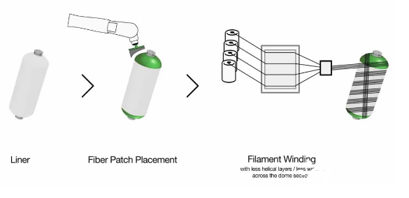 Cevotec的解決方案是在儲氫瓶的圓頂區域應用碳纖維貼片,從而取代了典型的纖維纏繞模式中的高角度螺旋層(HAHL)。如果采用纖維貼片(FPP)技術加固儲氫瓶的圓頂區域,可以節約15%的材料、重量和成本,并將總制造時間縮短 20%。Cevotec表示,通過使用FPP圓頂增強材料,制造商在后續的纖維纏繞過程中需要的材料更少。