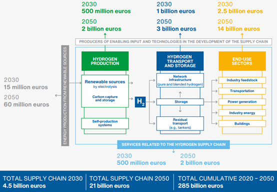 在發(fā)展情景中,氫供應(yīng)鏈的總價(jià)值在2030年為45億歐元,在2050年為210億歐元,2020-2050年期間的總價(jià)值為2850億歐元。
