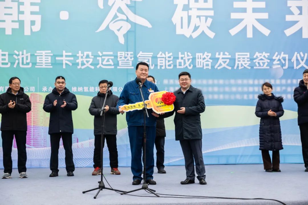 在會場所有領(lǐng)導(dǎo)的見證下,維納氫能執(zhí)行董事宋琦向陜鋼集團(tuán)龍鋼公司黨委書記、董事長陳驍交付車輛鑰匙,伴隨韓城市委副書記張景鋒的宣布,33輛重卡鳴笛啟動,以氫能重卡為核心的綠色運(yùn)輸工作正徐徐展開。