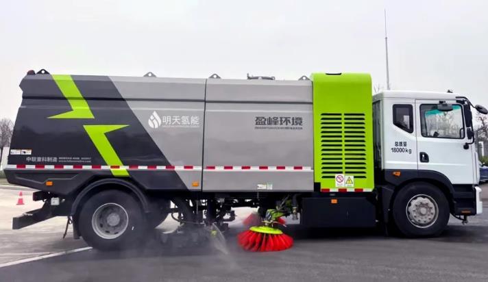 本次開展運營的車輛是由明天氫能聯合中聯重科盈峰環境、東風商用車共同研發的18T燃料電池洗掃車。該車搭載了明天氫能公司的101kW高性能燃料電池系統和990L超大儲氫系統,可以持續運行長達480km的作業續航里程。該產品在作業表現上具有凈率高和速度快的特點,并集成了路面洗掃、清掃、路沿刷洗、噴霧降塵等多種功能,實現了一車多用的效果。
