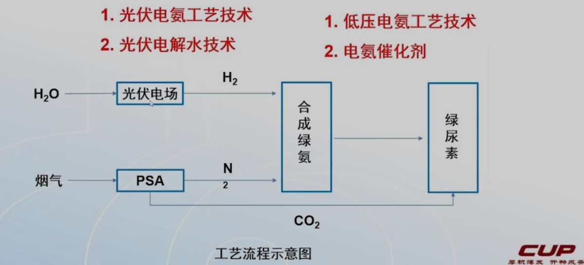根據(jù)上圖可以看出,利用水通過電解水制氫得到氫氣,再把一些煙氣通過變壓吸附得到氮氣和二氧化碳,氫氣跟氮氣就是合成氨,而氨與二氧化碳可以做尿素,這個過程可以不消耗任何的化石能源,完全利用綠電,包括合成氨的反應(yīng)過程也可以用電加熱的方式,原來一個高能耗、高排放的過程就變成低能耗甚至沒有排放的綠色過程。
