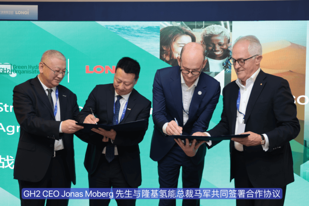 12月5日,共推全球氣候問題的最高峰會(COP28)于迪拜召開,隆基綠能與GH2國際綠氫組織在光伏+隆基展臺簽署戰略合作框架協議。澳大利亞前總理Malcolm Turnbull先生、GH2 CEO Jonas Moberg先生、中國產業發展促進會氫能分會副會長兼秘書長張宇女士以及隆基綠能創始人、總裁李振國、隆基氫能總裁馬軍、隆基綠能品牌總經理霍焱等出席此次活動。