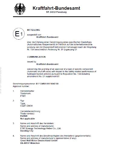 近日,未勢能源氫用瓶閥系列產品之電磁閥,在專業第三方認證機構TUV南德的審核下,順利通過耐壓性試驗、泄漏試驗、極限溫度壓力循環試驗、耐鹽霧試驗、車載環境試驗、電氣試驗、振動試驗、預冷氫氣試驗等多項試驗,成功獲得由德國交通部(KBA)頒發的ECE R134標準認證證書,這也是國內氫能企業獲得的首張70MPa E-Mark證書。