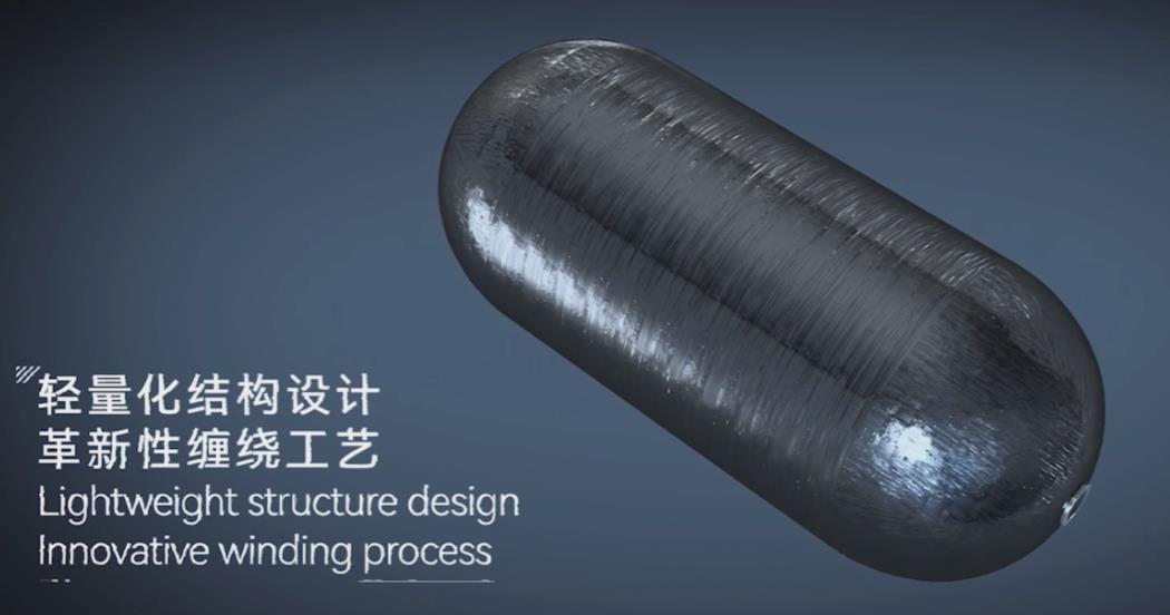 此款儲氫氣瓶容積為57L,陸續攻克了包括內膽原材料選型和成型工藝、密封結構設計、輕量化結構設計及革新性干法纏繞工藝等多項技術難點,質量儲氫密度達到6.1%wt,超過美國能源部(DOE)設定的2025年質量儲氫密度目標值5.5%wt,纏繞效率比傳統纏繞工藝提升40%,綜合成本下降20%,疲勞壽命實驗已經突破了44000次,優于當前國際市場主流同類產品的產品指標,達到世界先進水平,主要適用于氫燃料電池乘用車高壓儲氫系統。